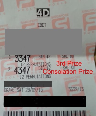 Below is the 3rd Prize and Consolation Prize Winning Ticket on 28 Sept Sat 2013